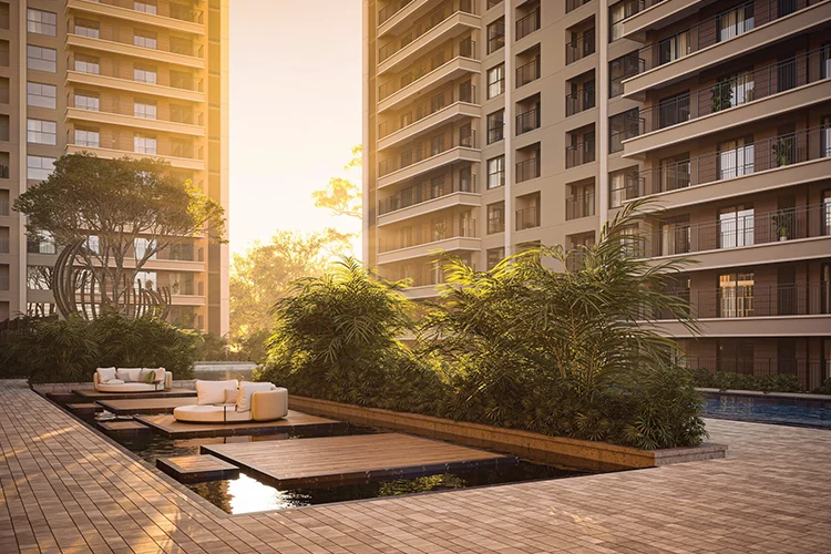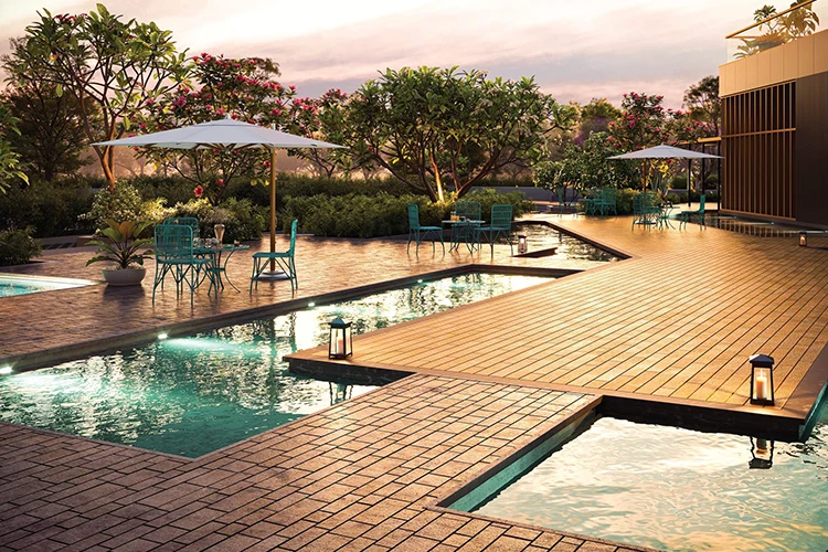 The water amenities alone are substantial: a 25-metre and 50-metre lap and leisure pool, Kids' Pool, The Jetty, Floating Decks, Bio Pond, and Sun Deck. The clubhouse occupies 1 lakh sq.ft. one of the largest in the sector. The planning philosophy is clear: give families reasons to stay within the community rather than drive out for recreation.