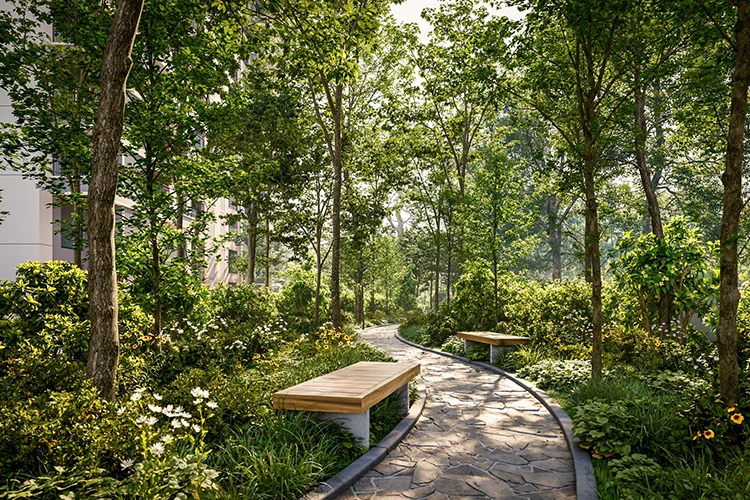 The master plan spans 12 acres with Phase 1 covering 4.96 acres and 336 residences across two G+40 high-rise towers. Open and green spaces account for a significant share of the footprint. Signature outdoor features include a 430-metre Nature Trail, Canopy Grove, Reflexology Walk, a 65-metre Skating Rink, and a 4-acre dedicated sports complex with international-standard facilities.